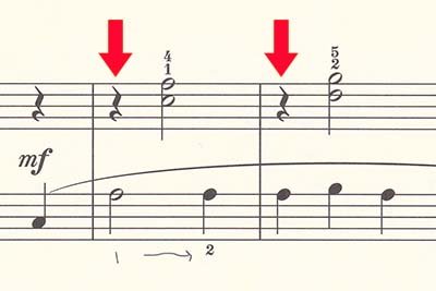 最初の小節でスタートが決まっても、次の小節の頭で右手が休まないといけないのを忘れて音を伸ばしてしまったりして……。