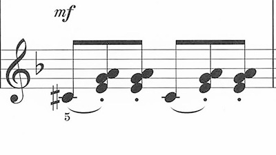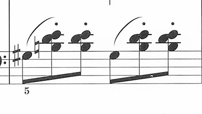 強いて言えば、左手の伴奏に出てくる「1音+3音+3音」の組み合わせが不慣れで若干弾きにくいかな、という感じ↓
