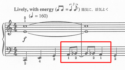 右手の小節またぎのスラーに気を取られて、左手のズンチャッチャのリズムが崩れがちなのです。