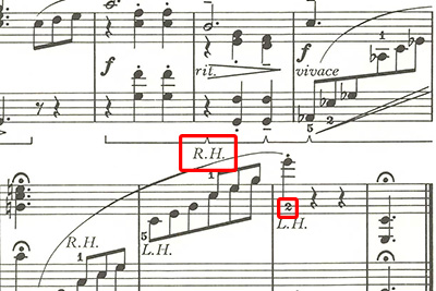 中央の「R.H. (右手)」は、上の段への指示なのか、下の段への指示なのか、パッと見では分かりにくくありませんか?